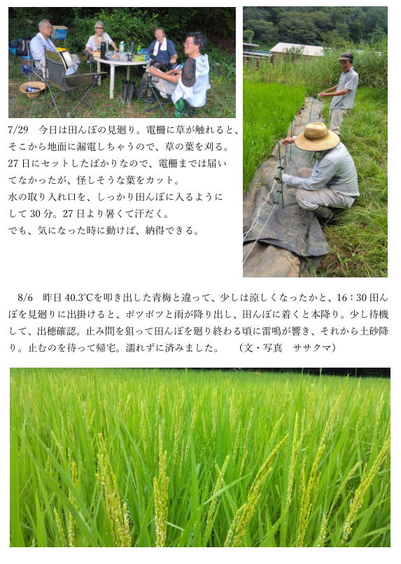 夏の暑さと、度重なる台風で、稲はスクスク育っているが、草はガンガン伸びている。8/7前日始まったリオ五輪開会式の寝不足もものとせず、集まったのは、吉野・白沢・ササ・東の4名。田んぼを一通り見回して、出穂確認!花はまだ出ていないけれど、田んぼに入るのは今日が最後と、4名草取り開始。「暑い!」腰は痛いし、稲はチクチク、太陽ギラギラ。炎天下で腰を伸ばすとクラクラする。30分で3名ギブアップ、白沢頑張る。一休みして、「やるか〜!」自分に気合を入れる。それでも30分やって12時15分前、「もう〜昼〜!」って3名上がる。白沢頑張る。「オ〜イ昼ダョ〜」って声かけてようやく上がってきた。午後も30分1本やって終了。お疲れさまでした。