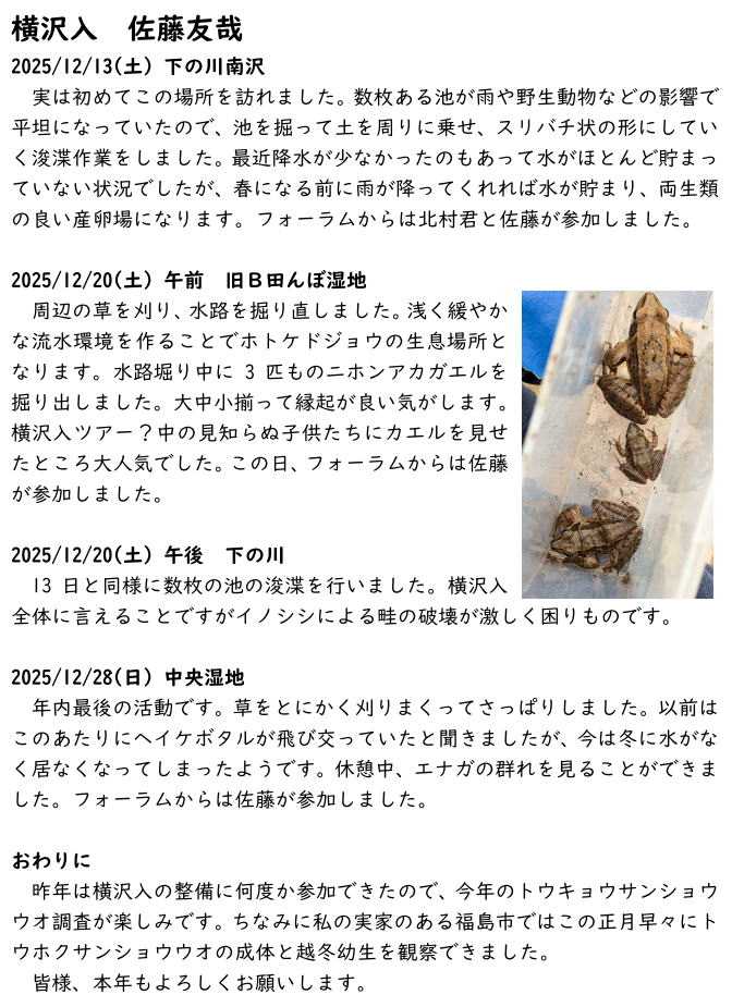 西多摩自然フォーラムは、@草堂入口と宮田東沢の湿地整備、A草堂ノ入森林整備、の活動計画を提出し、どちらの計画も了承された。@の湿地整備は、近年参加者が少なく作業が捗っていない。保全作業により止水域の水生生物の生息環境が復元・維持されるので、協力をお願いする。なお、草堂入口湿地は下部の畦が大きく掘れて水が抜けている。修復は大がかりな作業になる。